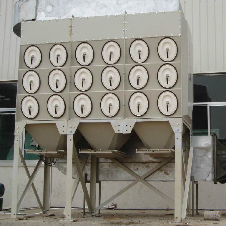 一般為負(fù)壓作業(yè),含有粉塵的氣體有進(jìn)風(fēng)口進(jìn)入濾筒除塵器內(nèi),在濾芯內(nèi)負(fù)壓的作用下,經(jīng)過濾芯過濾,進(jìn)入潔凈室從出風(fēng)口排出。當(dāng)粉塵在濾料表面上越積越多,阻力越來越大,當(dāng)達(dá)到設(shè)定值時,脈沖閥打開,壓縮空氣直接噴入濾筒中心,對濾筒進(jìn)行順序脈沖清灰,使其恢復(fù)低阻運行。含有粉塵的氣體進(jìn)入過濾室,比較大的粉塵顆粒直接落到灰斗,含有粉塵的氣體經(jīng)過濾芯凈化,粉塵會粘附在濾芯的表面,干凈的氣體經(jīng)過濾芯口到達(dá)靜氣室,在有引風(fēng)機經(jīng)煙筒排入大氣中。當(dāng)濾芯便面的粉塵不斷的增加,導(dǎo)致除塵器內(nèi)的阻力增加,當(dāng)阻力增加到一定的數(shù)值時,控制儀會發(fā)出信號,進(jìn)行程序的控制,這時脈沖閥會逐個打開,壓縮空氣通過噴口對濾芯進(jìn)行噴吹清灰,在壓縮空氣的噴吹下,附在濾芯上的粉塵層快速的脫離濾芯落入灰斗中,在由螺旋輸送機或卸灰閥直接排出。
