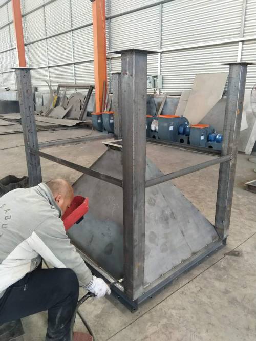灰斗由上灰斗和下灰斗兩體連接而成,其壁板均采用4mm厚鋼板焊制,外表均焊有足夠強(qiáng)度的角鋼為加強(qiáng)筋?;叶废虏窟€焊有大孔格柵網(wǎng)。檢修換袋時可以從上方將濾袋直接放入灰斗,落在板柵網(wǎng)上,然后從灰斗從孔門處即可統(tǒng)一取出,既減輕工人勞動強(qiáng)度,又實現(xiàn)了清潔操作,深受檢修人員的歡迎。